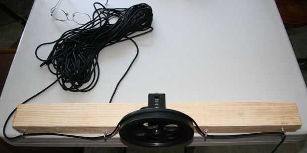 Pase el cable a través de dos de los tornillos de ojo, sobre la rueda, el a través de los otros dos tornillos del ojo.