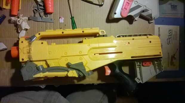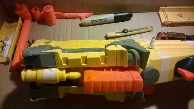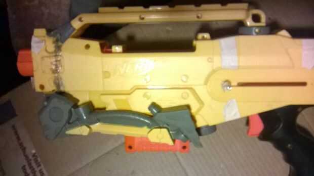 Coincidentemente, la parte alargada naranja que va en la parte delantera de la pistola, corté la punta de donde cabe en la parte superior delantera de la pistola (el pin de la vista).