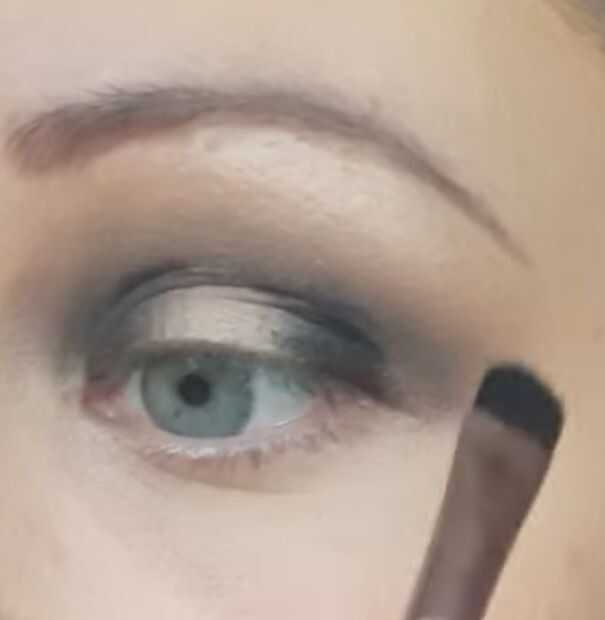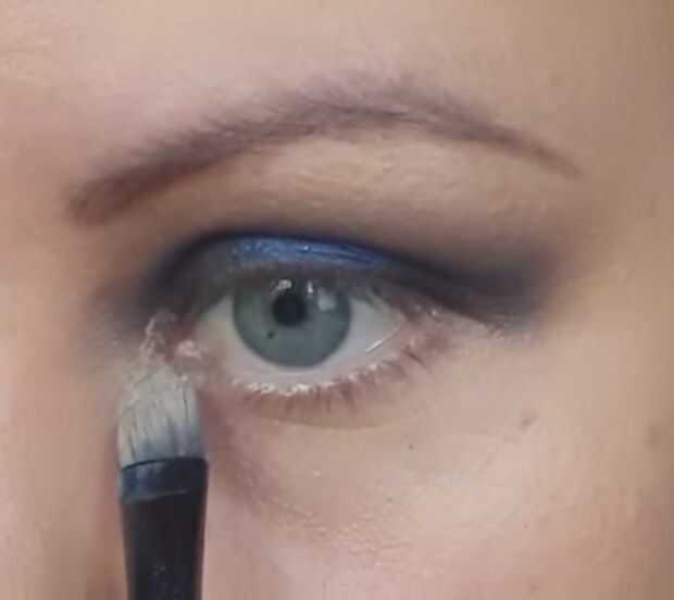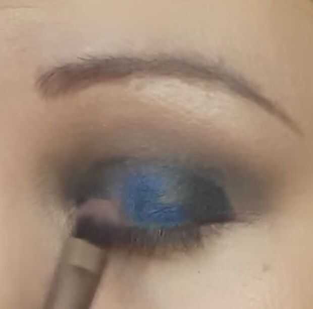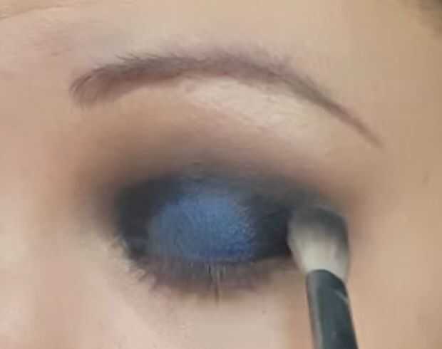 Luego toma una sombra de ojos negro esta aplicado a la esquina exterior y ángulo interno del ojo y el aplicar un azul de Marina de guerra real al centro del ojo y luego mezclar todo esto en conjunto. Tomo el cepillo suave desde la esquina interior del ojo y hacia fuera en la esquina externa para ayudar a la mezcla negra en juntas. Esto también ayuda a la mezcla azul también. Luego tome un color oro brillo y aplicar esto al hueso interior de esquina y frente para crear un punto culminante.