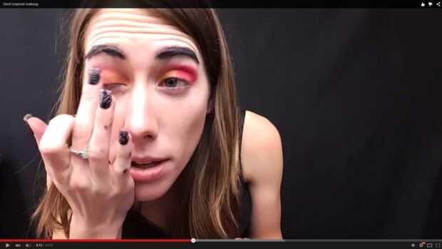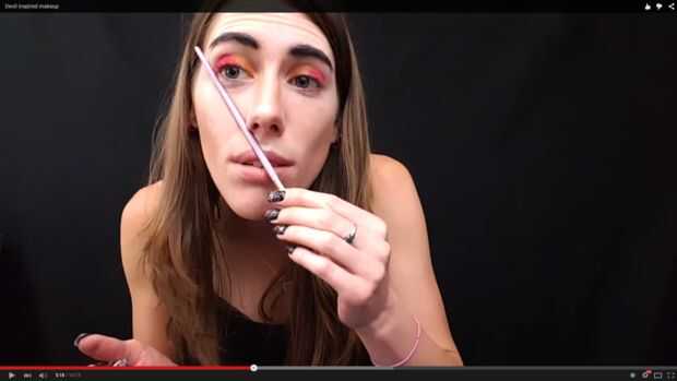 Luego tomando un borde afilado (utilicé un pincel) agregué rojo al lado de mis ojos haciendo un punto agudo.