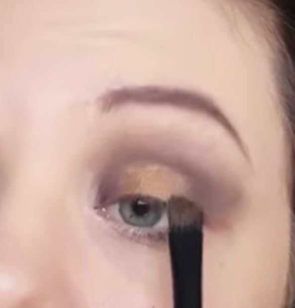 Así que primero con un color beige van a querer aplicar esto al pliegue del ojo como un color de transición. Luego se mezcla un ciruelo oscuro y negro que aplicar delgadas en la parte interna de la tapa y luego en la esquina exterior y alrededor de la tapa en el pliegue. Primero hacerlo con un cepillo pequeño para que tenga más control y más fácil de ver que todo esto tiene que ir. Luego toma un cepillo de suave y mezcla esto por lo que hay no hay líneas duras y parece muy ahumado. Luego con un pincel plano primero solicitar esto con algún spray de configuración y aplica una sombra de ojos oro al centro de la tapa y asegúrese de que se mezcla en las sombras