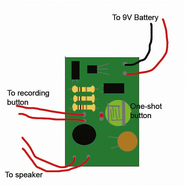 Este es un dibujo que hice de la pequeña placa de circuito que es la totalidad de lo módulo de la grabación. Tiene un pequeño Altavoz, clip de batería 9V, interruptor de botón en un mini adjunto PCB, otro pulsador conectado a la placa principal, un IC negro-gota, varias resistencias, condensadores y un transistor.