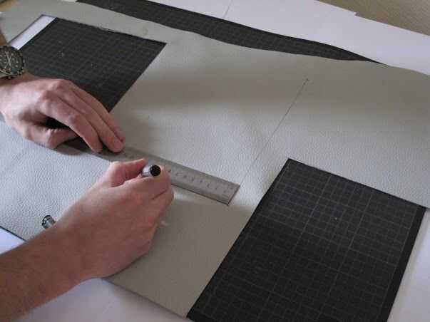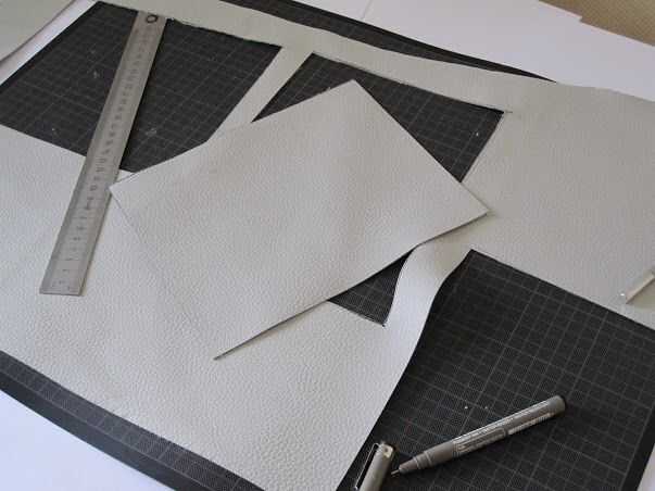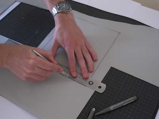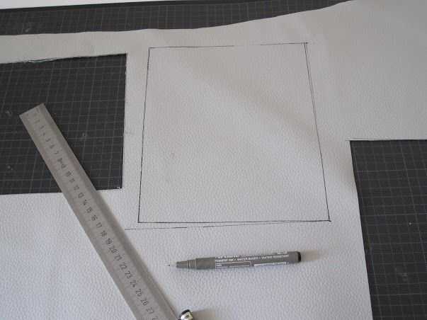 TEKEN een rechthoek van 23 cm x 19 cm op het leder en snij deze vervolgens uit met een breekmes en een ijzeren lat.
