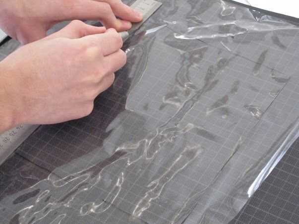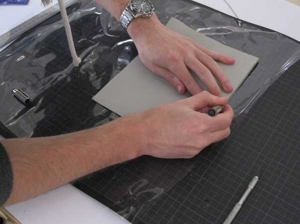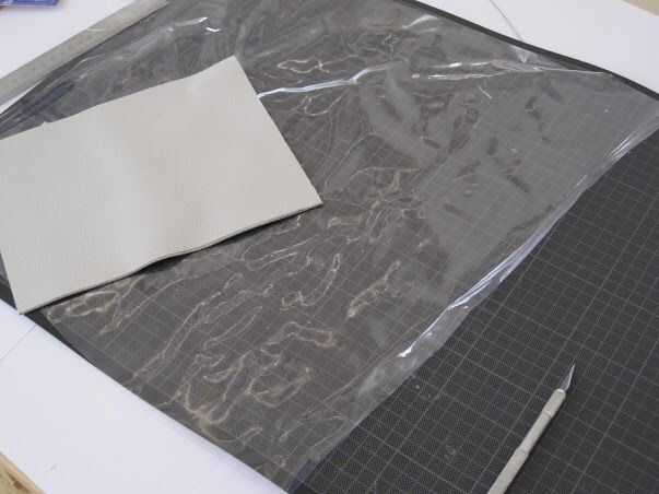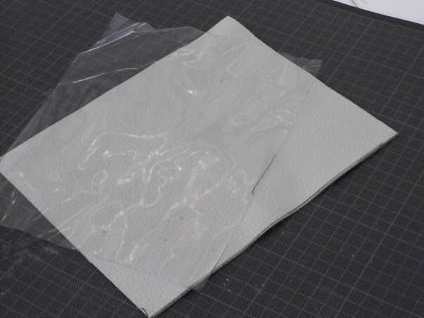 Snij een zelfde rechthoek uit het plástico. (Piscina eventueel de eerste rechthoek als sjabloon.) De vorm van de plástico mag iets groter zijn dan die van het leder. De overtollige randen Kunnan achteraf weggesneden worden.