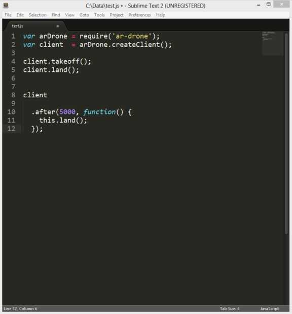 Por ahora copiar mi sencillo programa en la imagen y guardar como 'test.js'. Esto tendrá el despegue del abejón, flotar por unos segundos y luego la tierra. Consulte el paso siguiente sobre cómo ejecutar este programa.