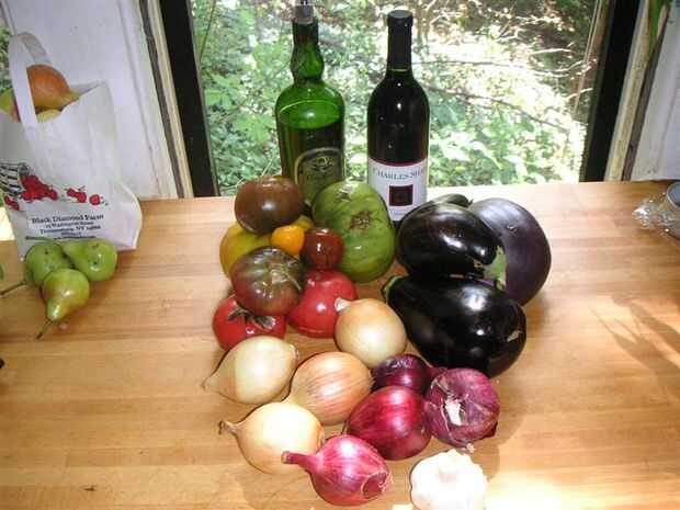 So. Ir a comprar los tomates: aquí tengo unos 4 o 5 libras. También desea comprar una cantidad similar de berenjena (berenjena, si usted habla inglés británico) y una cantidad similar de cebollas, rojas o amarillas, no importa. Probablemente desee un poco más tomate que otra cosa. También querrá comprar unos calabacines (a.k.a. calabacín), que he conseguido hábilmente dejar fuera de la foto. Usé uno grande, aproximadamente una libra y media. Usted querrá también aceite de oliva virgen extra, vino tinto barato y sal. También tendrá algún tipo de hierbas: Romero es buena, la albahaca también es buena, perejil hará si tienes nada mas.