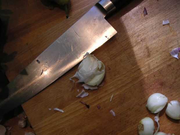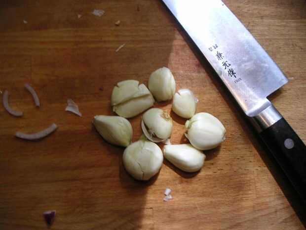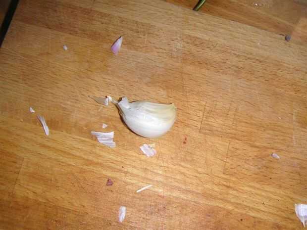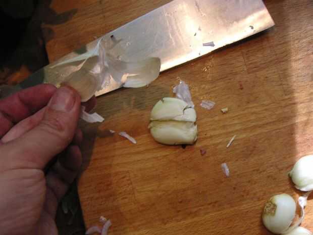 Tomar un diente de ajo y poner el piso de su cuchillo en él. Presione hacia abajo sobre el piso con las manos hasta que se smooshes. Luego levante el cuchillo y tire el ajo de la cubierta de papel. Hecho. Una vez que has pelado el ajo y picar, relativamente fino y añade a la sartén.