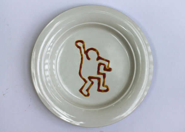 Para crear tu placa de Keith Haring-inspiración, primero necesitará la figura central del esquema. Utilice un taco sumergido en salsa para crear la línea, redipping según sea necesario, como si usar una pluma fuente. Asegúrese de limpiar cualquier salsa perdida con su trapo al terminar.