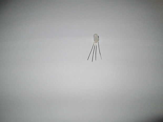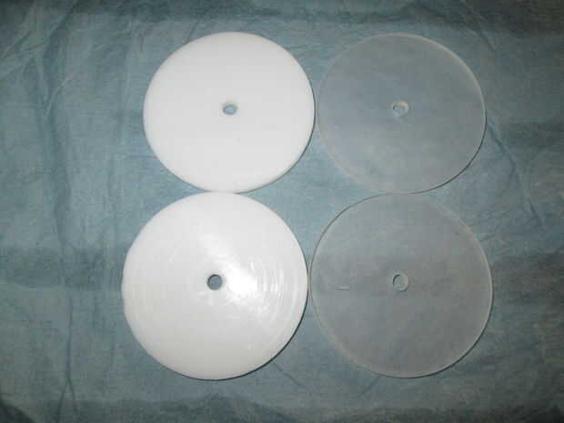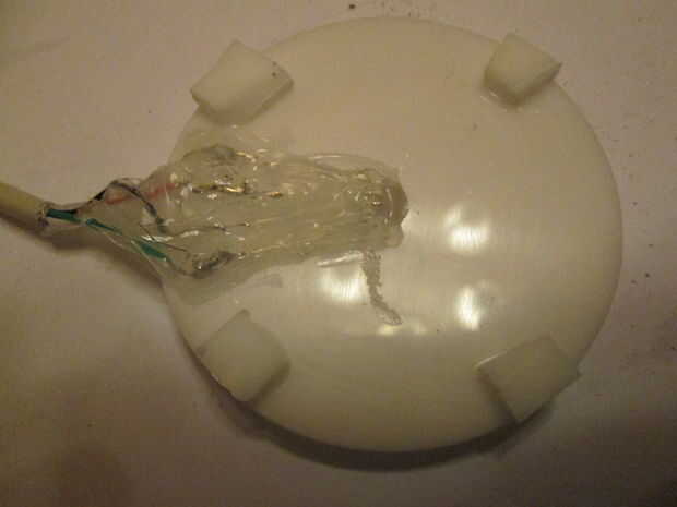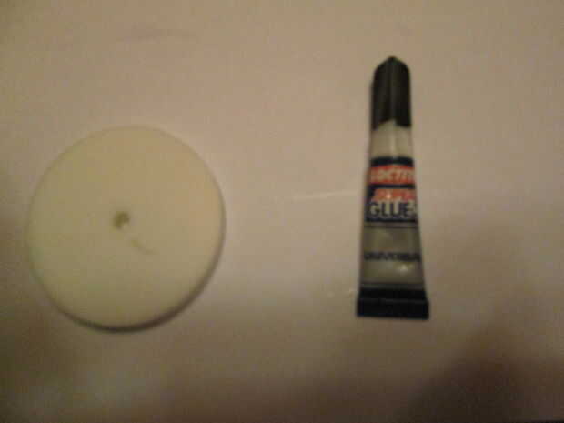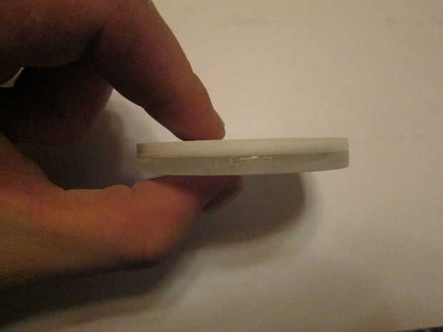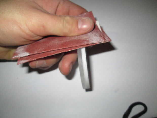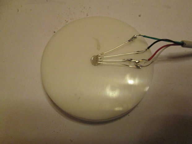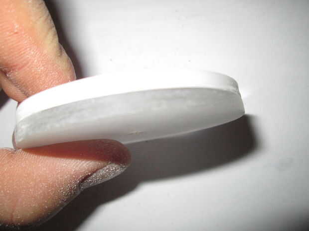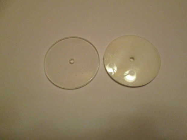 A continuación tome una clara plexiglás disk.sand de un disco plástico blanco en la superficie y el lado del disco plástico transparente. Pega los dos discos together.put el led dentro del agujero en el centro y doblar las piernas down(see picture)