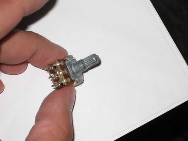 tengo dos opciones: sacar mi potenciómetro vol Junta poco o hacer mi control remoto con poco y dos potenciómetros... (esta foto es otro potenciómetro por ejemplo... No quité vol potenciómetro del tablero pequeño) - sin embargo, ver foto... 6 piernas de potenciómetro... cable de LAN tiene 8 cables...