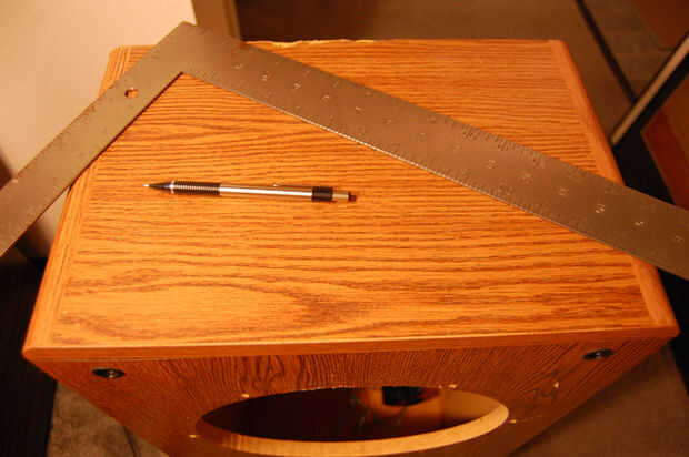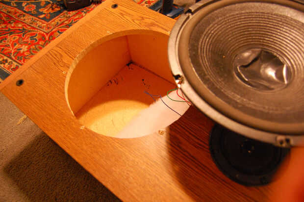 Me tomé el tiempo a sacar mi woofer y asegúrese de que no había nada que pudiera perforar y juzgar el espesor del material en la base de mis altavoces. No tomar ninguna responsabilidad por daños a los altavoces si los altavoces están sellados y no pueden ver fácilmente dentro de ellos para asegurarse de que no golpeas algo con el taladro.