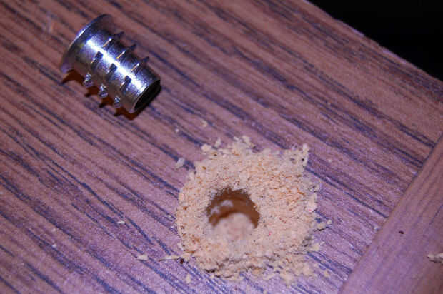 Importante: si los altavoces están hechos de un material de prensa Junta/MDF que no sea una madera sólida, intente primero una 1/16 menor broca que el recomendado (es bueno probarlo en un pedazo de material primera, si es posible). Para éstos, seguí los consejos de los revisores en partes Express y utiliza un 5/16" bits en lugar de 3/8" recomendada. Esto es porque el material del MDF estilo puede destrozar hasta bastante fácilmente y ayuda a obtener un ajuste más apretado Si utilizas un agujero más pequeño.