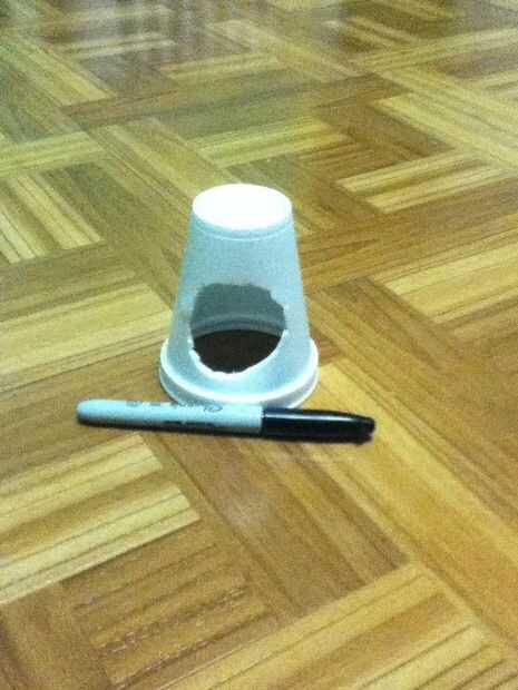 Ok grab ahora las tazas (eso es lo que ha dicho) y corte un agujero en cada uno. Asegúrese de que las tazas Coloque el rollo está utilizando y también asegurarse de que no es demasiado grande. También puede utilizar su pluma o marcador para hacer una marca en donde cortar.