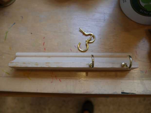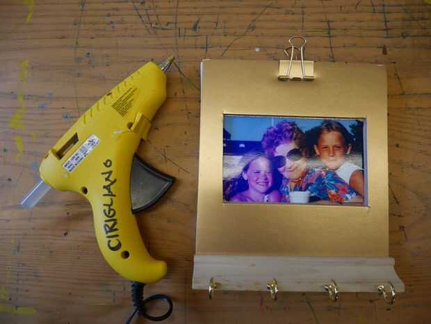 espacio los ganchos uniformemente a lo largo del borde de la bandeja de letra y atornillarlas. Entonces usando la pistola de pegamento caliente fije los ganchos en el borde inferior del marco. También clip el clip binder en el borde superior. Esto se utilizará como una percha.