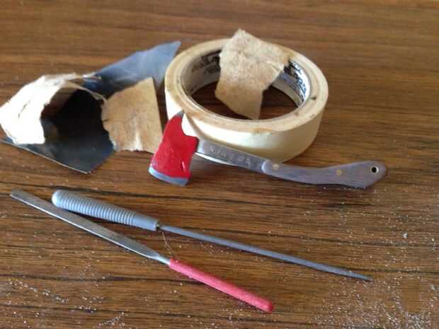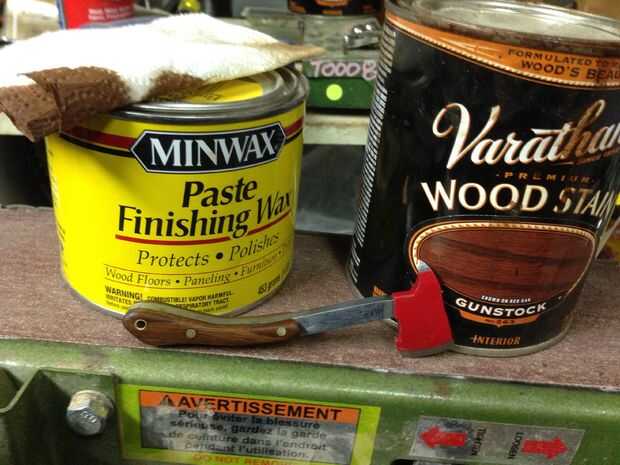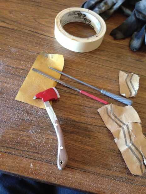 Retire la cinta adhesiva, arena y archivo alguno en spray. Yo también lija los bordes de corte de hacha para darle ese aspecto auténtico! Después de terminar de lijar la madera, agregar su opción de revestimiento de madera. Opté por manchas y cera de mina, me encanta la forma en que saca el grano de madera. Si usando el acero suave agrega algunos cera de las abejas para proteger el metal contra la oxidación.