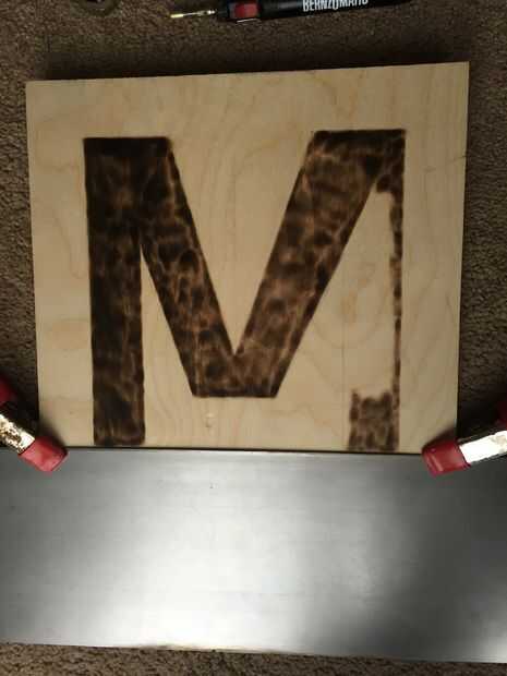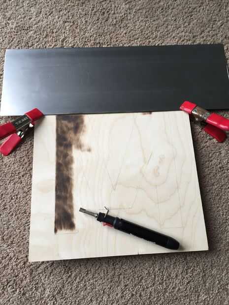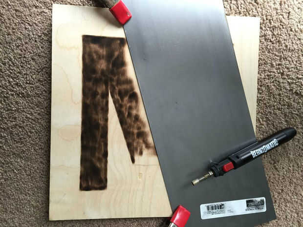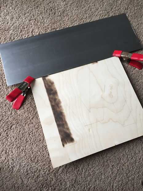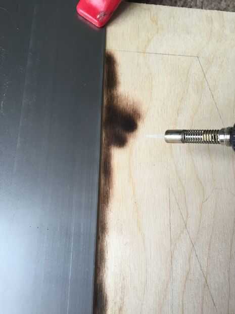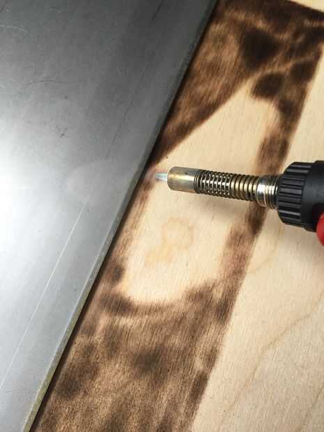 Alinee la chatarra de metal de hoja con la línea de lápiz y fijarlo con la abrazadera hacia abajo. La luz de la antorcha! Lentamente mueva hacia atrás y de cuarto a lo largo de la madera y variar la altura hasta encontrar su punto dulce, mina fue aproximadamente 1/4 pulgada de distancia.