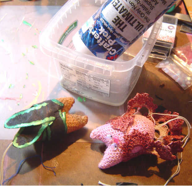 Las alas entonces fueron pegadas a cada cuerpo.  Ala y cola de encaje son todas de una sola pieza, y alas y la cola de cuero se pegan en capas.  Luego cada uno fue pegado a su base.