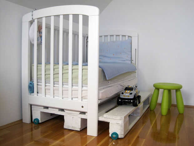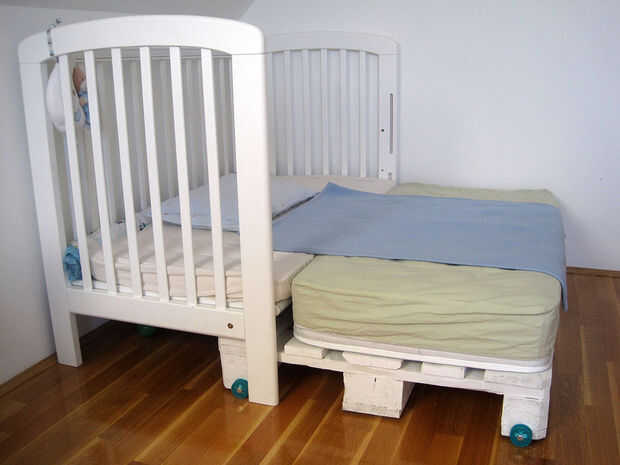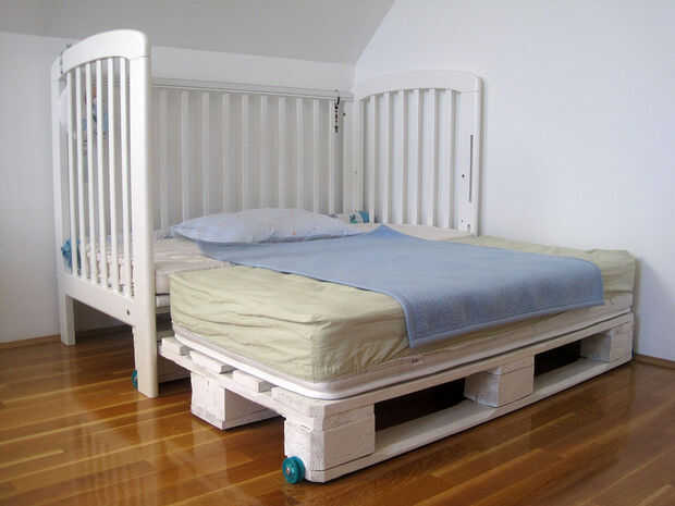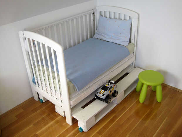 Después de la arena y la paleta de pintura y retire el panel frontal de la cuna, es sólo una cuestión de alinear ambos niveles - era realmente afortunado que todo "hizo clic" desde el principio: la altura de los dos colchones, el diámetro de las ruedas, la altura de la cuna,... (Realmente no hizo ninguna medición antes: D). También, debido a las medidas de ajuste perfectas, paleta se deslice debajo de la cama fácilmente.