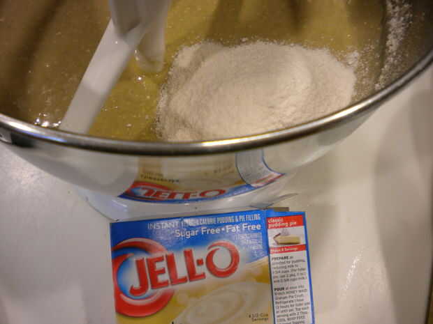 4. combine la mezcla de torta, leche, agua, huevos y aceite en un tazón grande. Batir a velocidad media con una batidora eléctrica durante 2 minutos. Vierta en el molde que preparaste.