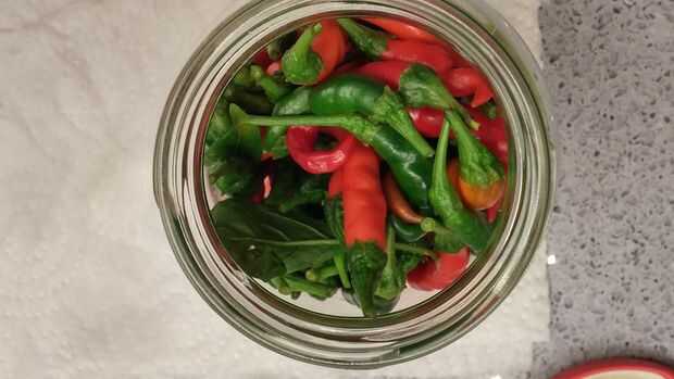 Estaba en un tiro de conserva en vinagre y tiene un poco loco con Decapado lotes grandes de chiles tailandeses y Habaneros. Son algo difíciles de estómago a comer por su cuenta así que me quedé con un problema de qué hacer con ellos. Solución más fác