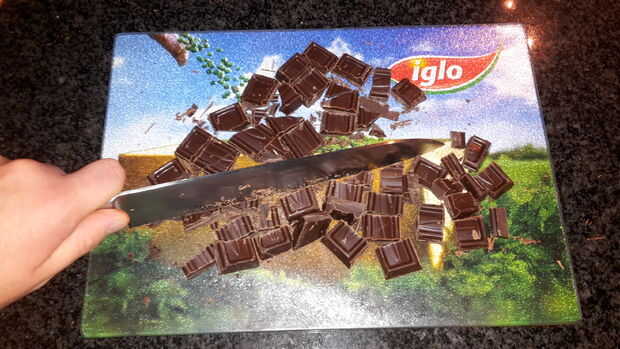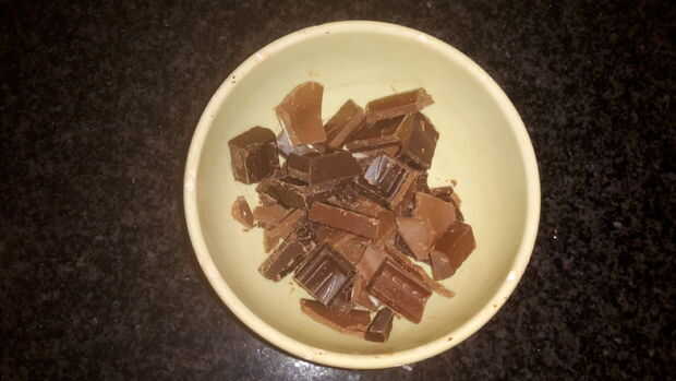 Luego corte barras de chocolate en pequeñas peaces.its importantes que tienen un tamaño uniforme. Hice una mezcla de oscuro el 50% y 50% leche