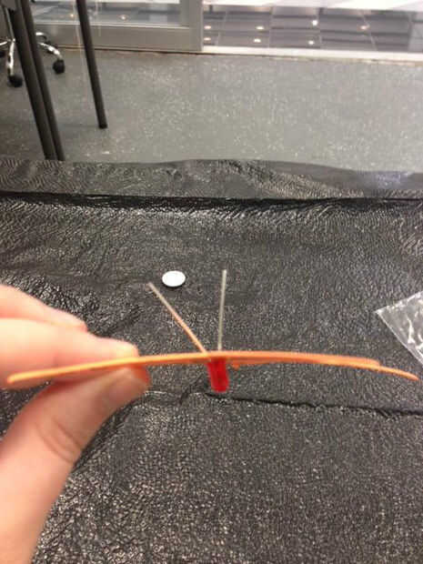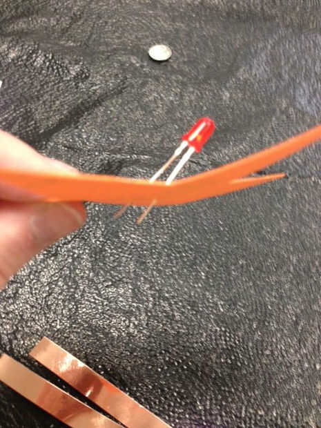 Meter las dos patas del LED a través de la estrella. El papel es cartulina, por lo que tendrás que darle un buen empuje. Si tienes problemas, haz lo Iniciado por meter unos agujeros en el papel con clavijas de empuje. Asegúrese de que usted recuerde que la pierna es larga y que es corto. Puede ser un poco difícil de decir en el siguiente paso.