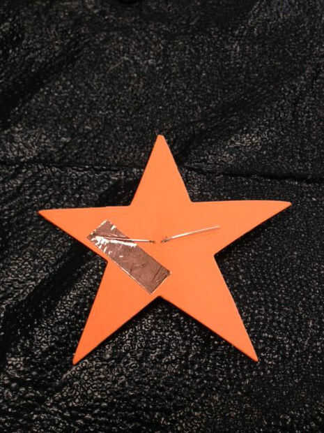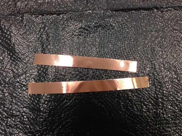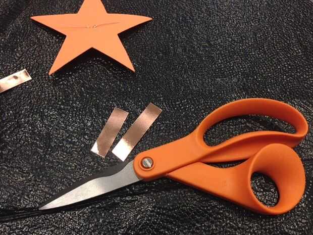 Cinta hacia abajo de la pata larga del LED con cinta de cobre. Puede que necesite cortar para que sea del tamaño correcto. Asegúrese de que usted fije la cinta con firmeza alrededor de la pierna del metal. El circuito se romperá si la pierna y la cinta de cobre no están conectadas firmemente.