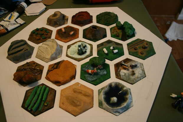 Empezar por encontrar el medio de la tabla. Me parece que dibuja dos líneas diagonales de esquina a esquina es lo más fácil. Coloque una baldosa hexagonal del juego centrada en el tablero y traza alrededor de él.