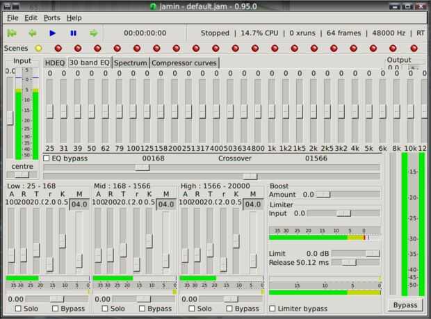 Jamin es principalmente un filtro que incluye dos amplificadores, un ecualizador parabólico banda de 1024, dibujado a mano con estantes (que está vinculada a un slider de banda de 30 menos complejas EQ), tres filtros pasabanda (lowpass, highpass, midpass), tres compresores (uno para cada banda), tres bateas estéreos, un calor, un limitador y un retraso para aquellos tiempos cuando los filtros necesitan evitarse para la comparación.