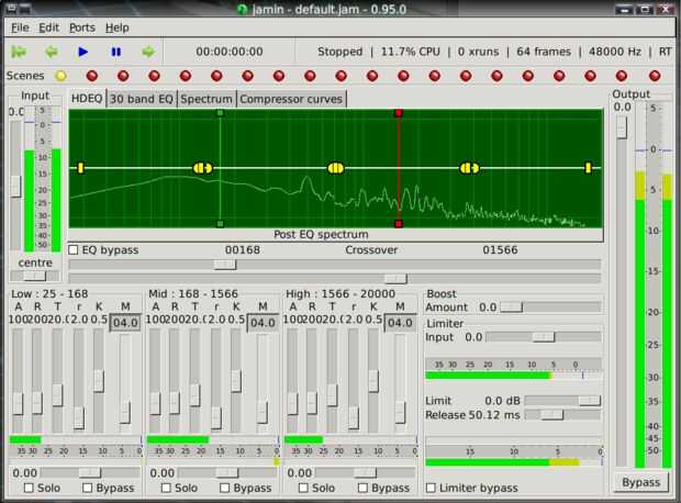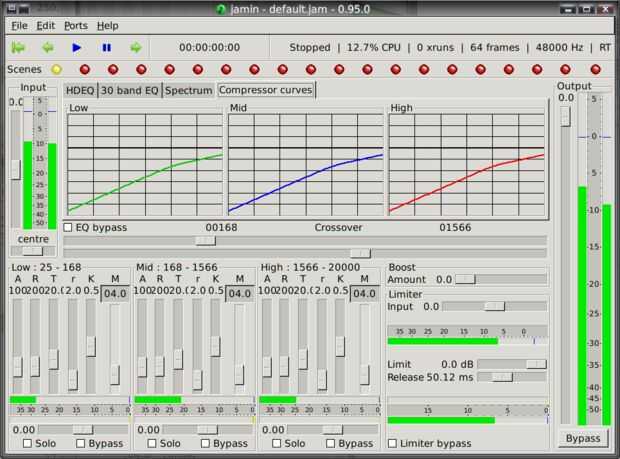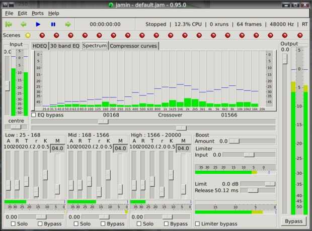 Sonido entra en Jamin. Un amplificador es el primer filtro, colocado para evitar que enarbola (pasando por el límite de volumen, lo que ocasiona distorsión) mientras se está procesando. Luego se pasa a través del ecualizador de combinación. Una vez igualados, entonces se divide en tres corrientes, una en el rango de alta frecuencia, uno en la gama de baja frecuencia y con el audio de rango medio. Cada una de las tres corrientes se introduce entonces en un compresor, para maximizar su volumen individual sin un pico. Luego, cada uno de estos se envían a través de una panorámica para que puedan estar en diferentes ubicaciones en el campo estéreo. Una vez que se filtró, estas tres corrientes se fusionan entonces, pasa a través del aumentador de presión del calor, hasta un limitador, que busque cualquier pico y reducir el volumen para evitar la distorsión. Finalmente, el sonido se pasa por el segundo amplificador para el ajuste final.