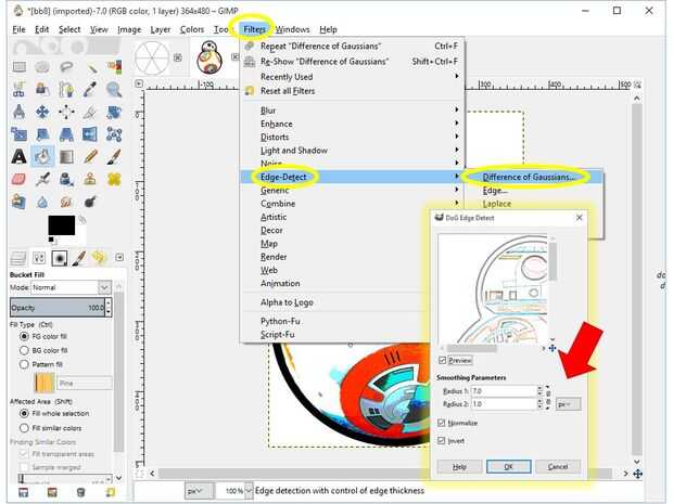 Mirar las opciones del menú en los cuadros y elegir filtro / borde detección / diferencia de Gauss. En las opciones de pop-up elige un grosor de línea que se ve bien a usted.