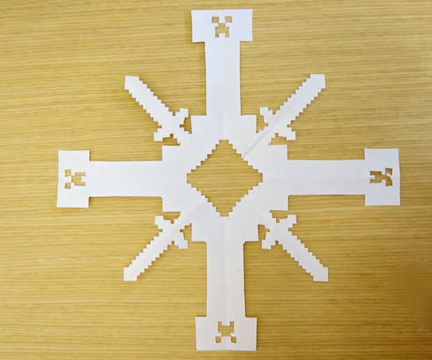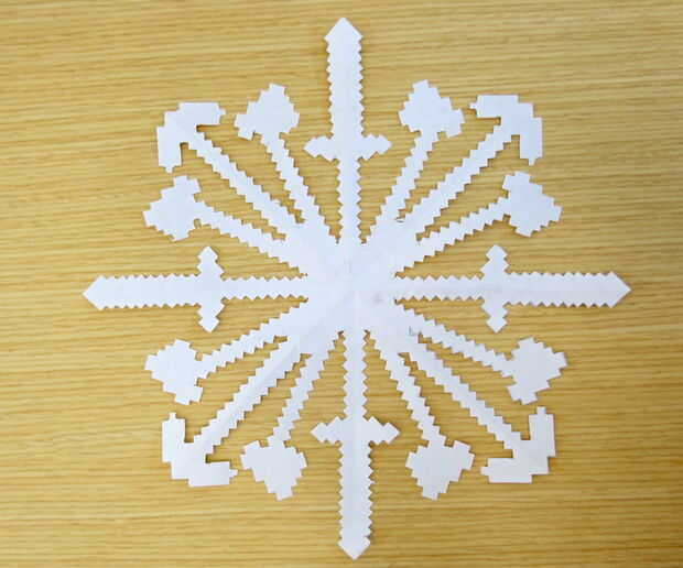 Así que mis copos de nieve evolucionaron a partir de mi idea original que era una enredadera y una espada. Sólo fue para él al principio y no hacer cualquier medición. Después decidí dividir las ideas y hacer copo de nieve de una de las armas y copo de nieve de una enredadera, he creado plazas para píxeles (1 por 1, 2 por 2, etc.) por lo que he podido conseguir el derecho de las dimensiones. Tuve que hacer un rodeo para que la enredadera no sólo sería un rectángulo de altura. Os he adjunto el archivo de Illustrator, si quieres cambiar un poco, y el PDF si sólo desea imprimir y cortar.