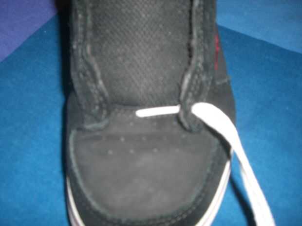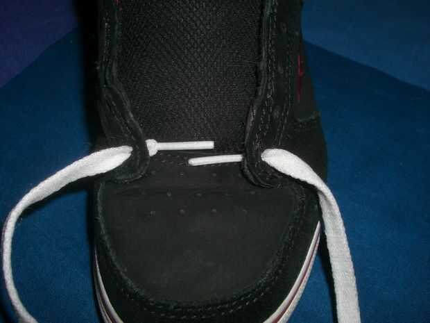 Este paso es bastante fácil acaba de poner la primera herrete en el orificio izquierdo de la parte inferior y el otro en el agujero inferior de la derecha. Ahora tire el herrete derecho hasta que el cordón esté en el lado derecho de la zapatilla.