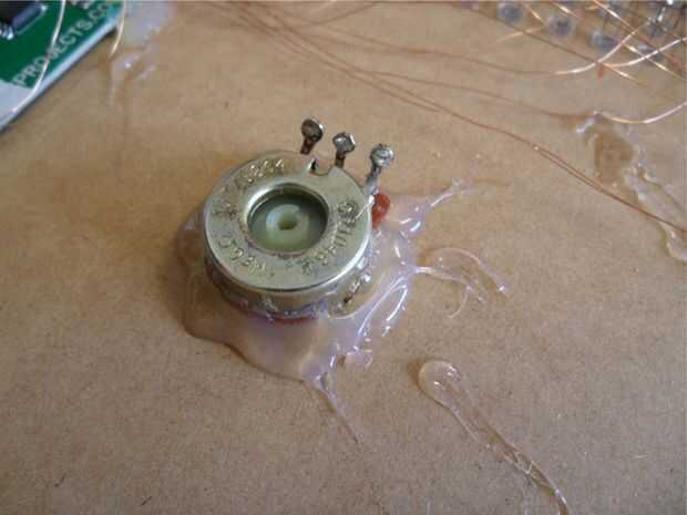 Una vez que los agujeros de perforado, se desea montar el Potenciometro en los agujeros y pegamento en el lugar con algunos pegamento caliente del derretimiento. Hacer esto para todos los cuatro potenciómetros. (ver foto cuarta)