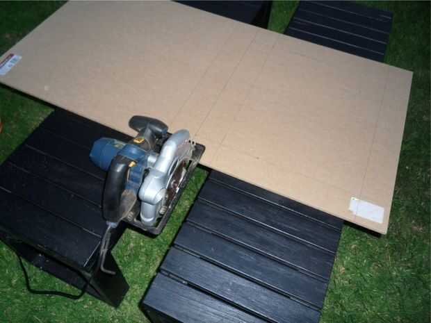 1. Cortar sus hojas de MDF de 9mm y 3mm de 61 cm x 53 cm (ver primera foto)