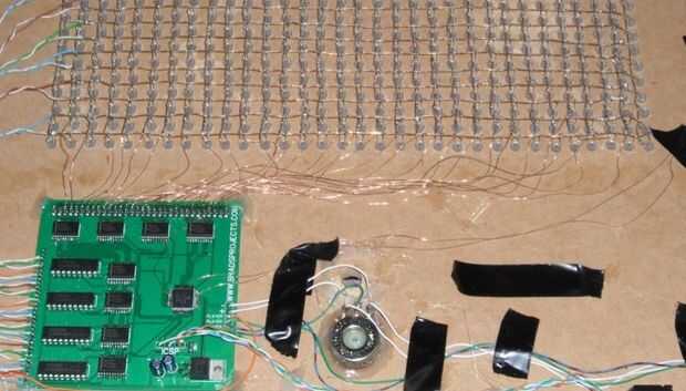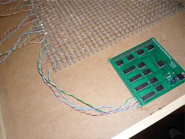 La primera foto muestra el tablero montado en la parte inferior de la tabla. Yo simplemente aplica pegamento caliente del derretimiento para cada una de las cuatro esquinas. Las almohadillas de soldadura en el lado izquierdo de la foto son para los cátodos. El circuito puede manejar hasta 32 columnas de cátodos pero puesto que este proyecto sólo utiliza 30, sólo necesita conectar el fondo 30. Sólo a partir de la parte inferior y suba (es decir La parte inferior de conexión PCB va a la columna de la parte inferior de los cátodos de los LED luego otro encima, van a la siguiente hasta etc....)