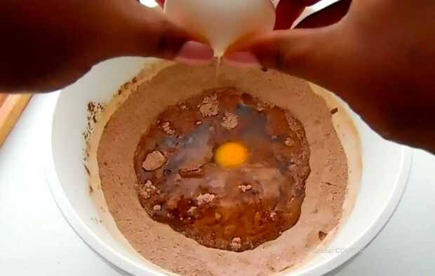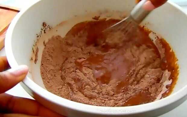Añadir todos los ingredientes húmedos (huevo, agua, aceite, vinagre). Agitar durante un par de minutos hasta que la masa es suave, rico y hace que desea bucear en.