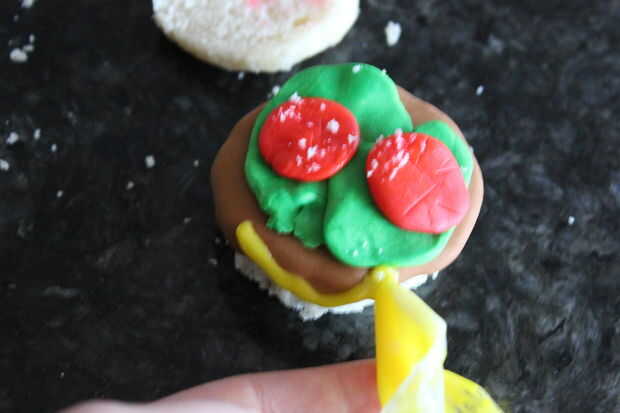 estos son unos cupcakes me y mi amigo hizo en una fiesta de pijamas. Cocinan algunos cupcakes chocolate de una mezcla de paquetes. Cuando estaban fríos cortamos un círculo pequeño de la torta de la parte superior. Luego se utilizó helar en una lata y