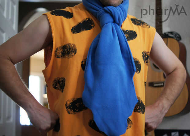 ¿No es Fred un buen deporte? Para este traje he utilizado 2 grandes polos naranja de Wal-Mart. Yo corte una esponja y utiliza pintura de tela para la impresión. Las mangas fueron cortadas y corté justo por debajo de los brazos en la 2 º camiseta para agregar longitud a la primera camisa (ver abajo foto de cuerpo entero). El lazo es realmente una bufanda de vellón (también de Wal-Mart) que corté para darle una sensación más desigual.