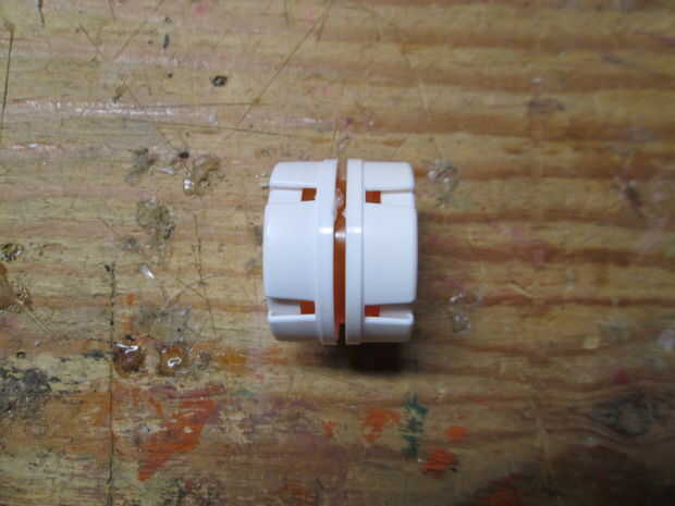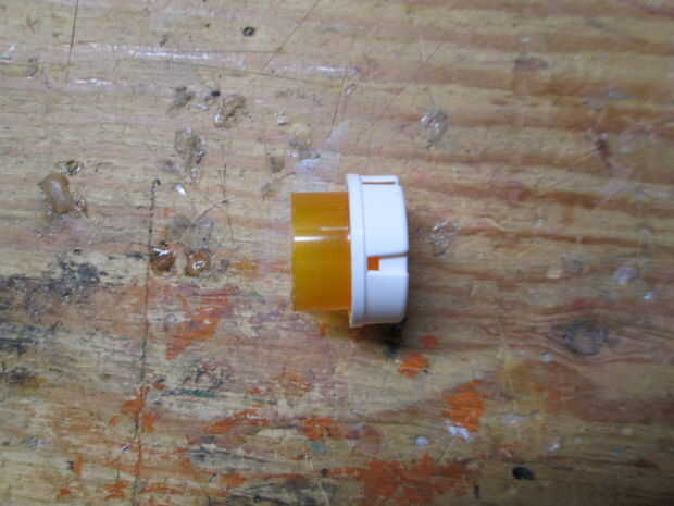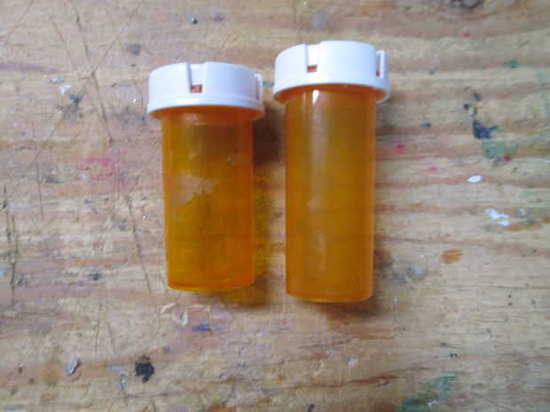 El cuerpo consta de 3 partes: la cubierta, la sección central y la parte inferior. Para crear nuestra sección centro, tomé la botella de píldora y aserrado de la parte inferior. Aserrado de larga suficiente para que cuando la otra tapa de la botella de píldora fue puesta allí, dejaría sólo una pequeña brecha (para asegurarse de que todavía podía cerrar). Si está usando un frasco de película, necesita darle más espacio que a la distancia entre dos cubiertas, por lo que hay espacio suficiente para los cables.