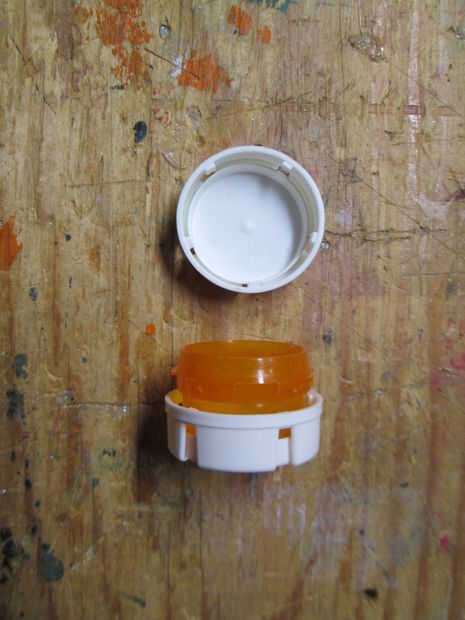 Con la pastilla de la botella todo cortado para arriba, es hora de pegarlos en. Que tornillos ya no debe pegar, pero uno que cubre la abertura se debe pegar fuerte. (Esto es para asegurarse de que cuando nos Destornillar la tapa del otro, esta cubierta se queda).