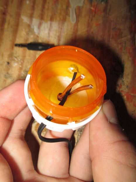 La pieza de metal que hicimos va a través del agujero en la tapa pegado en.