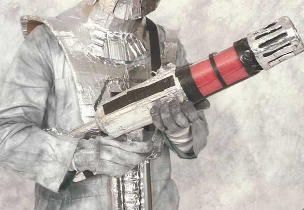 La parte más importante del cañón es el tubo transparente en el centro también conocido como la botella de plástico, se debe a tres pulgadas de diámetro y cerca de ocho pulgadas de arriba hacia abajo. en primer lugar, cortar la parte inferior de la botella para que pueda insertar la base, luego tome un pedazo de cartón grueso de cuatro pulgadas de y envuélvalo alrededor de la tapa de la botella donde comienza a afilar en el cuello de la botella y pintarlo de negro. luego realizar una, falta de un término mejor, escalera para formar la parte superior del cañón de la plata. Para hacer este puso dos pedazos de cartón alrededor de la mitad de una pulgada de espesor de tres pulgadas de distancia entre sí y paralelos uno al otro, luego poner tres tiras largas de cartulina, aproximadamente 1/4 de pulgada de grosor cada una y entre los dos paralelo las tiras y pegarlas con cinta de papel de plata. ahora esta en la parte superior del cañón y pegamento abajo. Finalmente, la pintura de rayas de cinta negra en el cañón y ponerse a trabajar en el cuerpo.
