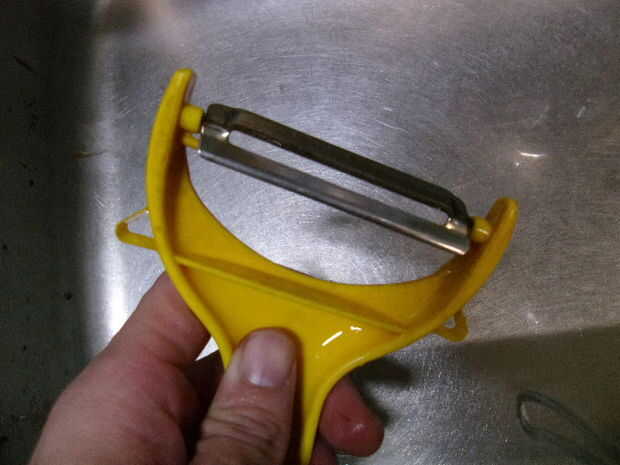 Cortar la superficie de la bardana por dispositivo especificado. No puedo recomendar que comiendo la superficie de la bardana. Generalmente, el cuchillo de cocina puede ser difícil de cortar la superficie de la bardana. Usé un dispositivo recomendado para eso.