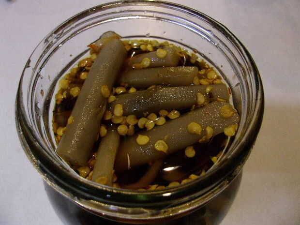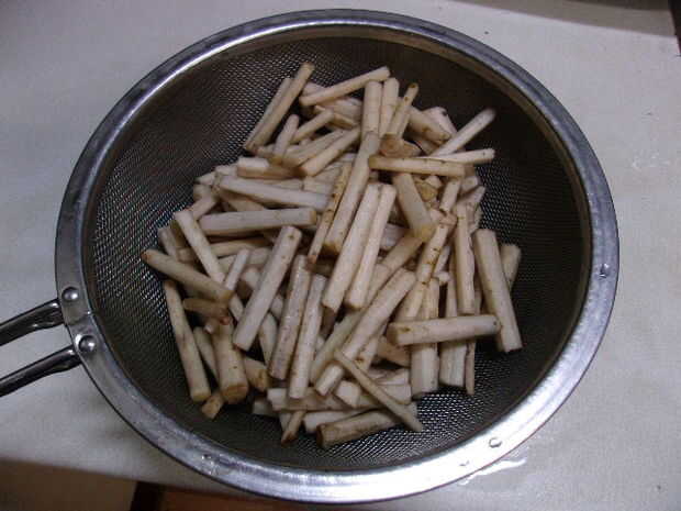 Después de todo un día, el sabor de la sopa se ha penetrado en la bardana. Pero la bardana es todavía crujiente. Además el sabor, el grado de crujiente nos dará algo bueno.