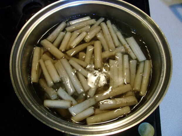 Antes de que se humedece en la sopa, la bardana se debe hervir durante 15 minutos. Tiendo a hacerlo. Porque no es rábano. Después de eso, la bardana hervida se lanza a la sopa.