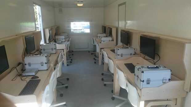 Esta es una parte del interior de Trondheim fabricantes móviles Makerspace, un trailer largo de 25" con espacio para 16-18 personas, 3D-impresoras, PCs, etc. Dev kits. Este es un trailer que presta a escuelas, clubes juveniles, bibliotecas y otras organizaciones aquí en media de la Noruega.