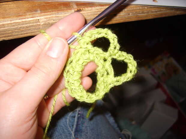 Hacer 1 cadena para transferir a la siguiente fila y luego un punto bajo en la misma puntada. Desde aquí hacer una cadena de 6, a continuación, saltar 1 punto bajo de la base. Haga un punto bajo en el siguiente punto de la base. Esto le dará un pétalo. Repetir este proceso completamente redondo, hasta que regreses al principio. Esto debería darte 6 pétalos. Otra vez, usar una puntada de resbalón para completar la fila.