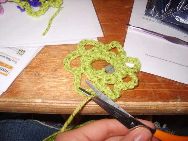 Para fijar apagado, hacer una cadena sola más. Cortar la lana y luego jale el extremo suelto de la cadena y tire hasta que quede apretado (haciendo un nudo).