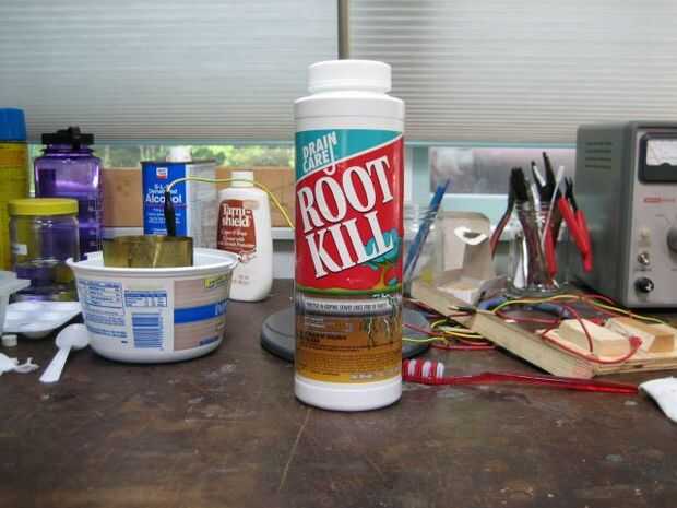 Matar de raíz - este es el hogar químico utilizado en el proceso de grabado. Lo que realmente buscamos es sulfato de cobre - que esto es 99%. Originalmente, vagué alrededor del área de jardinería de la tienda de mejoras para el hogar local buscando estas cosas y no encontrar en la frustración. Más adelante descubrí que está en el Departamento de fontanería, no de jardinería. Tenían muchas islas unas sobre de donde había buscado sin cesar. Hay otros "matar raíces" tipo proyectos por ahí. Mira los ingredientes y asegúrese de que lo que consigues es cristales de color azul y sulfato de cobre, no algo más. Cuesta $9,89.